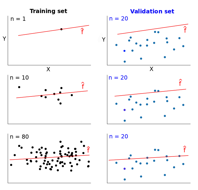 在第一行中,当 n=1(n 是训练集中样本的数量)的时候,模型能够完美地适应单个训练数据点。然而,同样的模型在具有 20 个数据点的验证集中性能很差。所以,模型在训练集中的误差是 0,但是在验证集中的误差特别高。