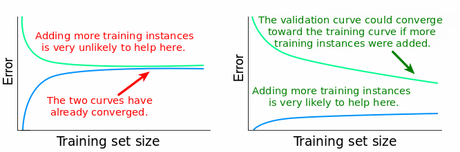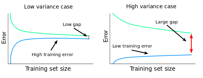 正如我们之前观察到的一样,如果 variance 比较大,那么说明模型过于拟合训练数据了。当模型过拟合的时候,它在泛化到从未见过的数据上时会存在问题。当这样一个模型分别在训练集和验证集上测试的时候,训练误差会比较低,验证误差通常会比较高。当我们改变训练集大小的时候,这种模式会继续存在,训练集和验证集之间的差距会决定这两个学习曲线之间的距离。