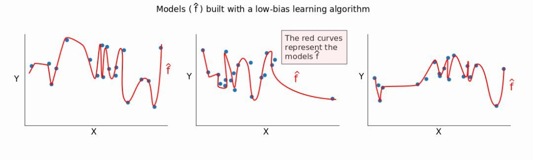 低 bias 的模型会很好地适应训练数据。如果我们改变训练集,会得到特别不一样的模型 f^。