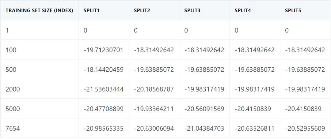 因为我们指定了 6 个不同的训练集大小,你或许期望看到每个误差得分有 6 个结果。然而,我们得到结果是每个误差得分对应着 6 行数字,每行有 5 个误差得分。