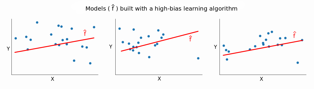 反过来也说得通:bias 越高,variance 越低。一个高 variance 的模型构建的简单模型通常是不能很好适应数据集的。当我们改变数据集的时候,从高 bias 的算法得到的模型 f^ 通常不会有很大不同。
