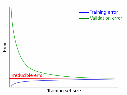 这告诉我们,在实际中性能最好的模型会收敛于某个不可约误差,而不是理想的误差值(对于 MSE,理想的误差值是 0;我们将会看到,其他的误差值会有和 MSE 不同的理想值)。