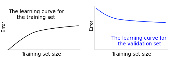因此我们会监控两个误差得分:一个针对训练集,另一个针对验证集。如果我们把两个误差得分随着训练集的改变画出来,最终我们会得到两个曲线。它们被称为学习曲线。