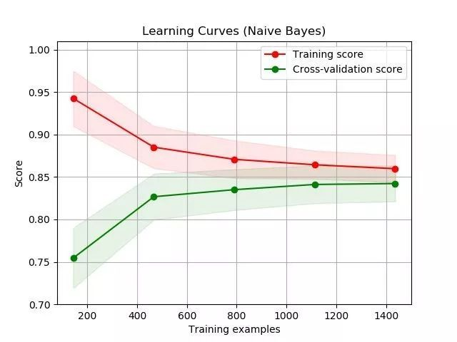 图源:scikit-learn 文档(http://scikit-learn.org/stable/auto_examples/model_selection/plot_learning_curve.html)