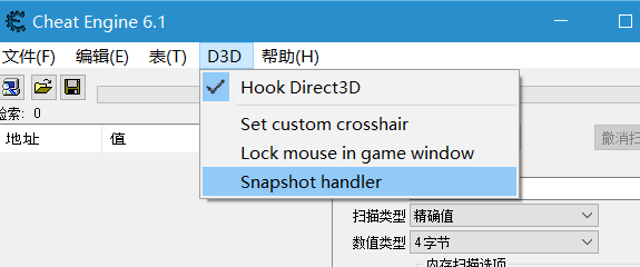CE已经提供了解决方案,看到菜单里的D3D了吧,打开游戏进程后把Hook Direct3D勾上,然后打开Snapshot handler