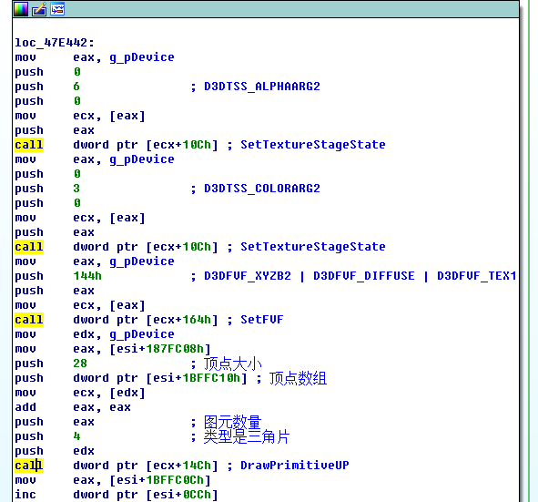 471A8D 主循环,调用渲染 4724CD BeginScene、EndScene 传入this,后面this都是这个,第一个this = [[[0x4E9A54] + 0x40]+0x24] 对其中一个edi,[edi+8]指向下层函数 4872F2 push 14,貌似自机特有 487B9C esi = [this + 0x1CA01D4 + 14 * 0x608],不为NULL则push到下一层 4818AE switch ([[this + 0x1CA01D4 + 14 * 0x608] + 0x18] >> 25) & 0x1F case 1 47E36E 设置顶点坐标、SetTexture 47DA73 SetRenderState 47E499 SetTextureStageState、SetFVF、DrawPrimitiveUP