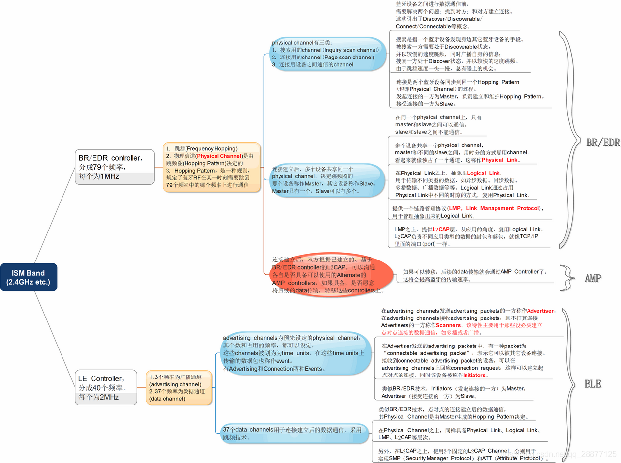 该图片是对Bluetooth Core的一个Overview,从RF的Physical Channel,到Baseband的Physical Link、Logical Link、LMP、L2CAP等概念,都有一些粗略的介绍。由该图片可以看出,BR/EDR、AMP、BLE等技术有如下的特点: