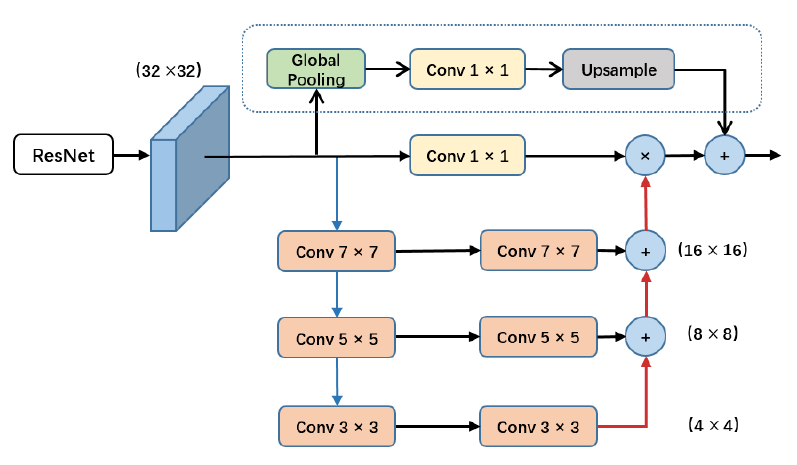 该模块能够融合来自 U 型网络 (如特征金字塔网络 FPN) 所提取的三种不同尺度的金字塔特征。为了更好地提取不同尺度下金字塔特征的上下文信息,我们分别在金字塔结构中使用 3×3, 5×5, 7×7 的卷积核。因为high-level的特征分辨率较小,故使用大的卷积核带来的计算负担不会太多。同时论文引入了全局池化分支用于进一步提升性能(虚线框部分)。