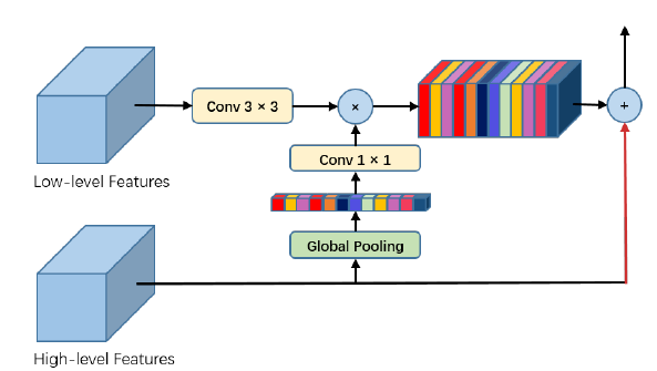 GAU是用在decode时候的单元,同样引入注意力机制,基本思路也就是high level feature map预测一个channel mask然后乘在low level shortcut上,具体实现如图。 具体来讲,使用3×33×3卷积用于对低级特征做通道处理,然后使用全局池化后的信息做加权,得到加权后的low-level特征,再上采样,然后再与high-level信息相加。