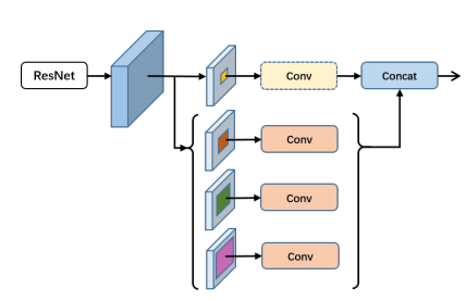 上述网络是PSPNet里使用的空间金字塔池化模型,但使用池化操作会有空间信息上的损失。而DeepLab使用空洞卷积会存在缺少局部信息和”griding”(卷积核退化)现象。因此作者并不使用空间金字塔池化和空洞卷积。