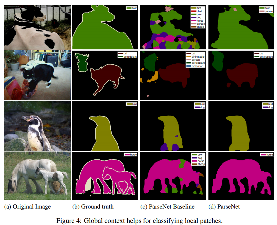 parseNet最大的贡献在于使用了全局语义信息(Global Context)来做分割,ParseNet可以直接对网络中任意一层进行全局池化得到一个代表全图特征的特征图,并利用这个特征图进行分割。