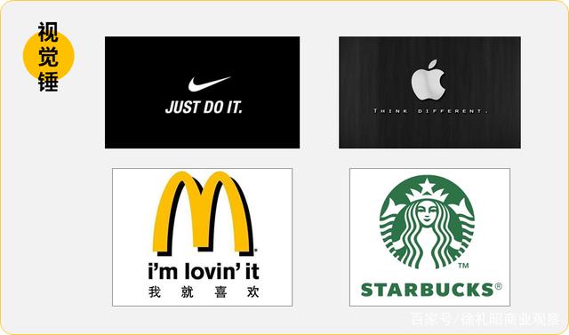比如耐克的钩子,麦当劳的金色拱门m,被咬了一口的苹果,星巴克的绿色美人鱼、绝对伏特加的瓶子等等。这些品牌视觉锤相对于文字宣传,则更具有冲击力,也更有利于加深大众对品牌的记忆。