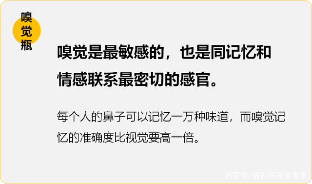 国际品牌大师马丁.林斯壮的研究指出:“人的情绪大部分是由嗅觉产生。美国研究机构的研究结果表明,人们回想1年前的气味准确度为65%,然而回忆3个月前看过的照片,准确度仅为50%。