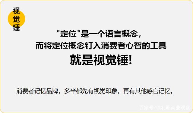视觉锤的形式十分广泛,几乎所有视觉元素都有可能成为视觉锤。不是所有视觉元素都是视觉锤,一个品牌的视觉锤必须表达出语言钉。只有不断在潜在目标群体中重复传播品牌的视觉锤,语言钉才可能被捶打进潜在客户的心智。并非所有品牌都有一个视觉锤,但是如果你的品牌拥有一个视觉锤,那么你的品牌将更容易成长为强势品牌。