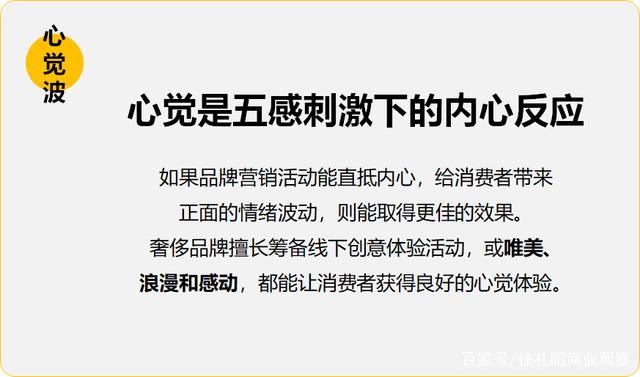 这里的“心觉”是指内心的感觉,不是觉悟。心觉是指在5种感官刺激下,对内心产生的情感波动。类似于营销理论当中的“情感营销”。