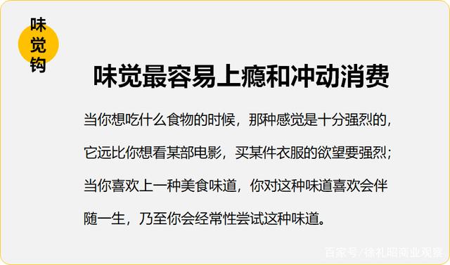营销的一个关键目的是:让消费者对品牌或对产品产生一种依赖,形成"成瘾性"的消费,变成品牌的忠诚型顾客。食物与饮料带来的味觉体验往往让人有回味无穷的感觉,而在所有感觉中,味觉也是最容易让消费者“上瘾”的。
