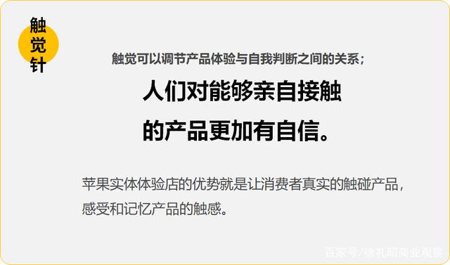 苹果在全世界范围内开设大型体验店,每家店每天吸引几千上万人到店触摸到真实的苹果产品。苹果的外观设计、材质与制造工艺也都是为提升消费者的触感服务的。