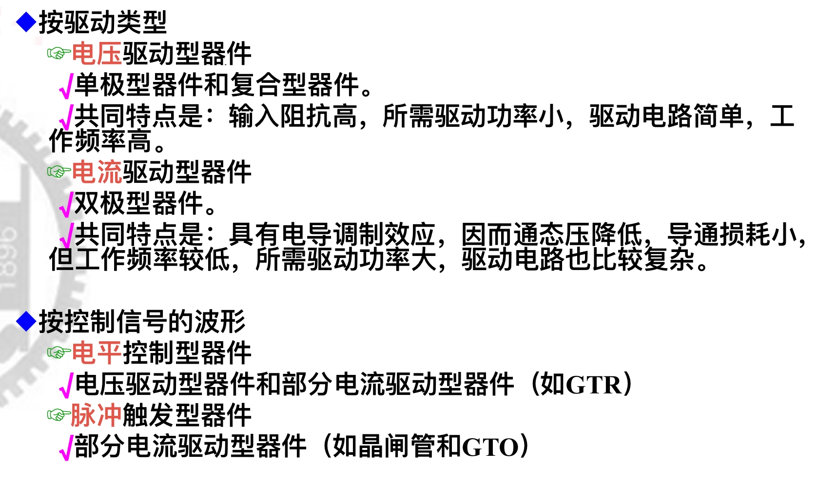 除此之外,还有按照驱动信号的性质和波形以及按照载流子参与导电的情况进行分类。