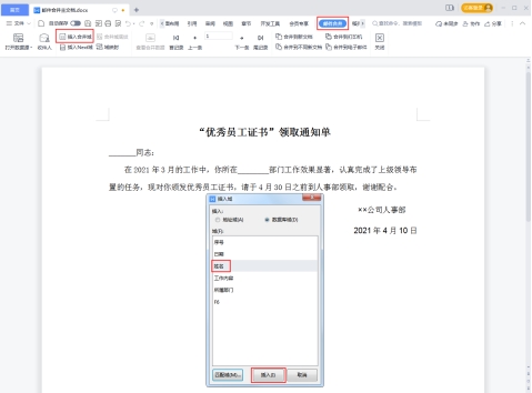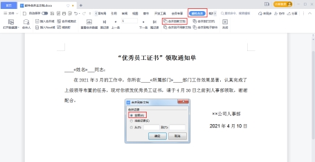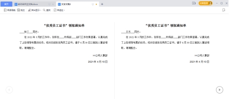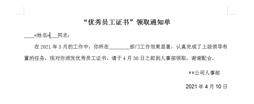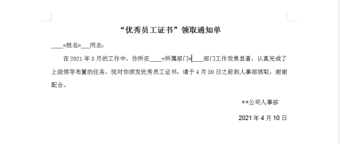 给某公司部分员工发一份“优秀员工证书”领取通知单,具体操作方法如下: