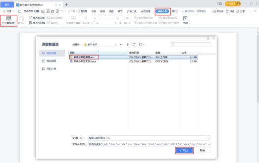 打开【邮件合并】选项卡,单击【打开数据源】按钮,弹出【选择数据源】对话框,在对话框中选择需要的数据源文件,单击【打开】按钮,如图2-196所示。