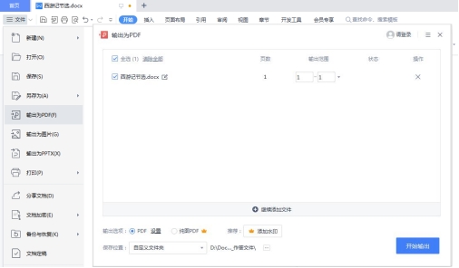 单击【文件】菜单中的【输出为PDF】命令,在弹出的【输出为PDF】对话框中,可以对文件重新命名,选择输出范围,将文件保存在指定的文件夹中,设置好之后,单击【开始输出】按钮,就可以将文字文档输出为PDF格式,如图2-202所示。