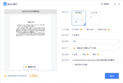 单击【文件】菜单中的【输出为图片】命令,弹出【输出为图片】对话框,可以对输出图片的方式、水印、格式、尺寸、颜色等进行设置,最后单击【输出】按钮,就能将文字文档输出为设置好的图片,如图2-203所示。