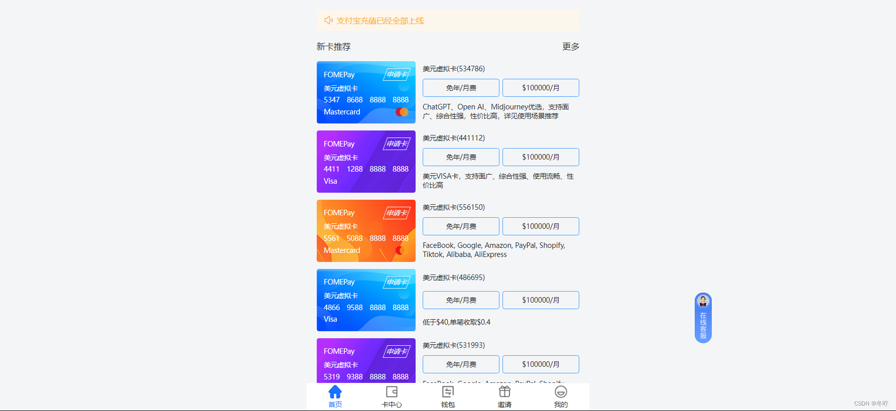 FomePay是一家专注于资产管理和跨境支付技术的香港金融科技公司。其核心价值观是专业、创新和诚信,致力于通过技术创新和变革为客户提供更优质的服务,助力他们更好地融入全球经济体系,并为自身和企业创造更多的价值和机会。其核心业务是虚拟信用卡发放,跨境支付结算。目前有港版和美版两种卡段,VISA/万事达都有。