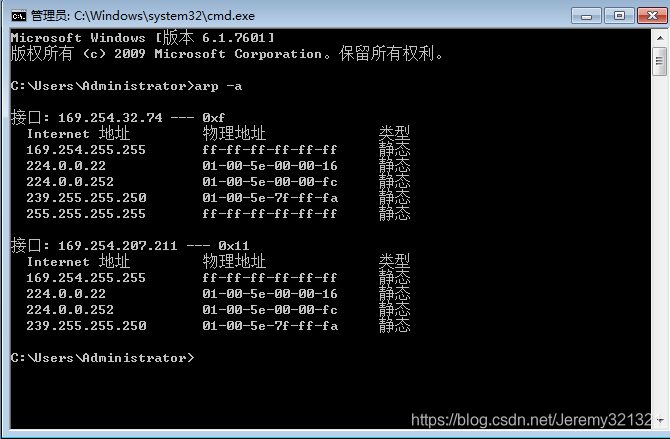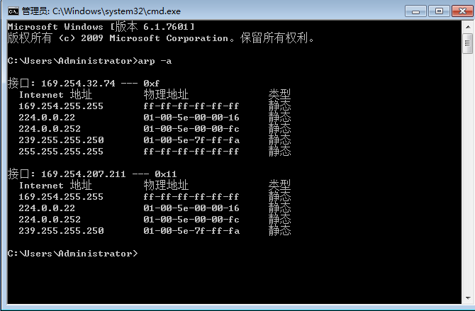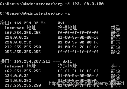 (1)显示高速cache中的ARP表: 命令 arp -a
