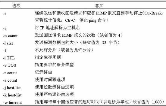 ping [-t] [-a] [-n count] [-l size] [-f] [-i TTL] [-v TOS] [-r count] [-s count] [[-j host-list] | [-k host-list]] [-w timeout] 目的主机/IP地址