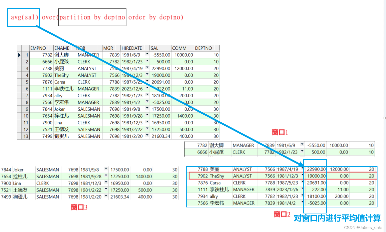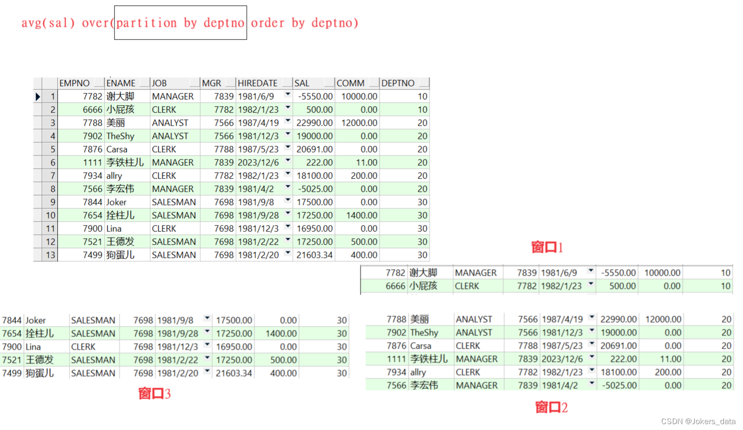 讯享网select deptno, ename, sal, avg(sal) over(partition by deptno order by deptno) avg_sal from emp DEPTNO ENAME SAL AVG_SAL 1 10 谢大脚 -5550.00 -2525 2 10 小屁孩 500.00 -2525 3 20 美丽 22990.00 12663 4 20 TheShy 19000.00 12663 5 20 Carsa 20691.00 12663 6 20 李铁柱儿 222.00 12663 7 20 allry 18100.00 12663 8 20 李宏伟 -5025.00 12663 9 30 Joker 17500.00 20340 10 30 拴柱儿 17250.00 20340 11 30 Lina 16950.00 20340 12 30 王德发 25000.00 20340 13 30 狗蛋儿 25000.00 20340