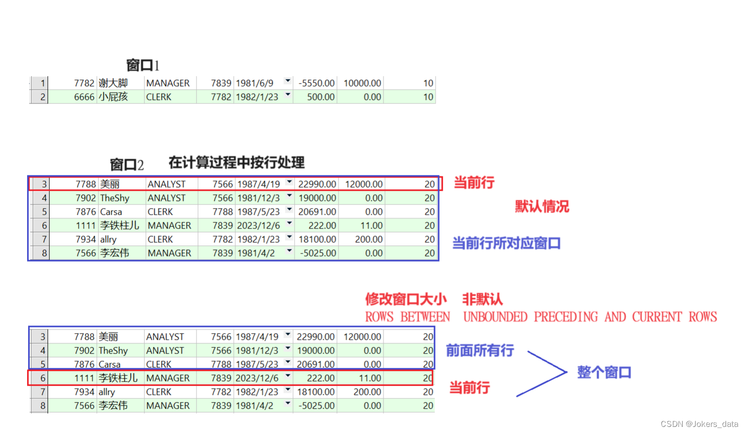 select deptno, ename, sal, avg(sal) over(partition by deptno order by deptno rows between 1 PRECEDING AND CURRENT ROW) avg_sal from emp DEPTNO ENAME SAL AVG_SAL 1 10 谢大脚 -5550.00 -5550 2 10 小屁孩 500.00 -2525 3 20 美丽 22990.00 22990 4 20 TheShy 19000.00 20995 5 20 Carsa 20691.00 19845.5 6 20 李铁柱儿 222.00 10456.5 7 20 allry 18100.00 9161 8 20 李宏伟 -5025.00 6537.5 9 30 Joker 17500.00 17500 10 30 拴柱儿 17250.00 17375 11 30 Lina 16950.00 17100 12 30 王德发 25000.00 20975 13 30 狗蛋儿 25000.00 25000