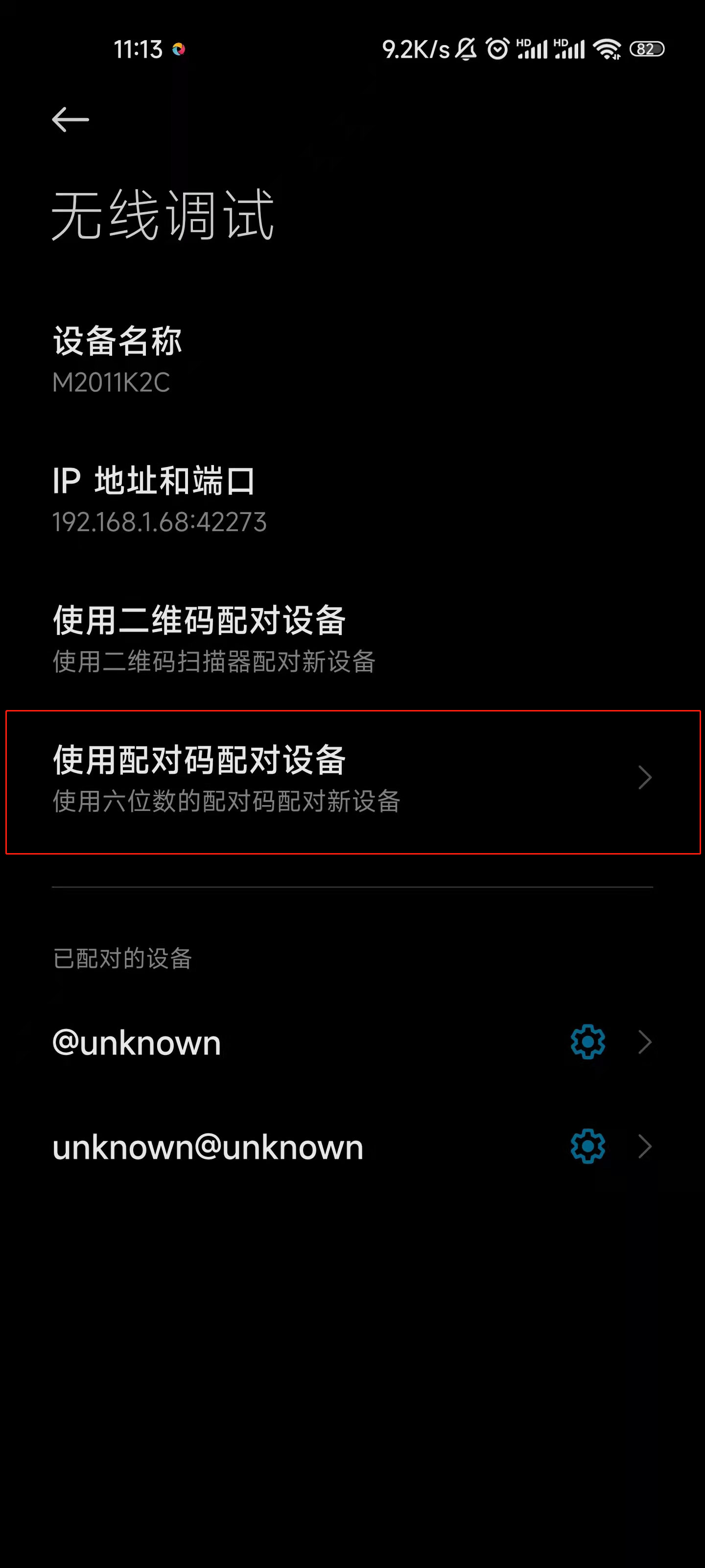 这种方法适用于Android版本11及以上,adb --version ≥ 30.0.0的条件使用。首先要确保手机和电脑在同一个局域网内(连接同一个WiFi),要把开发者模式和无线调试模式,选择使用配对码配对,需要记下配对码、IP 地址和端口号。