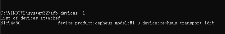 然后用adb命令查看连接设备 adb devices -l ,能看到设备信息就说明已连接到设备可以正常调试设备了。