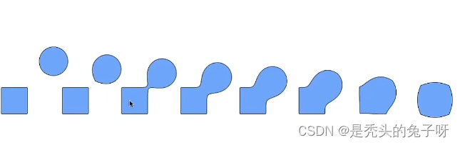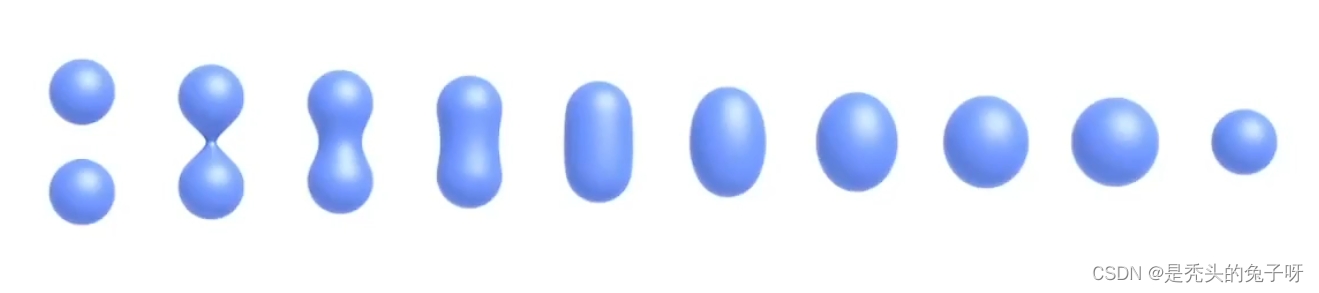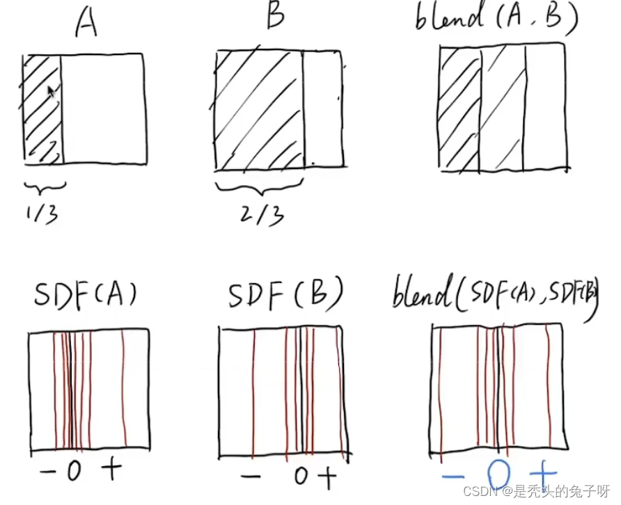 SDF(A)为A的边界融合值,SDF(B)为B的边界融合值,+为可以融合的距离,对SDF(A)与SDF(B)取一个Blend就可以在A、B之间中间的距离做一个融合并线性减弱,达到了上图的效果。
