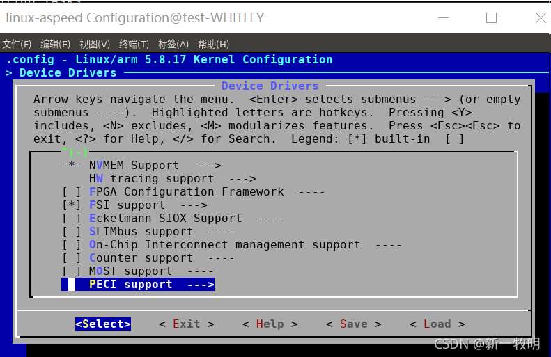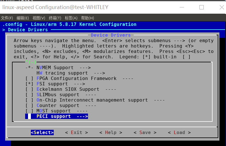 首层目录选中Device Drivers, 找到PECI support,回车选中。