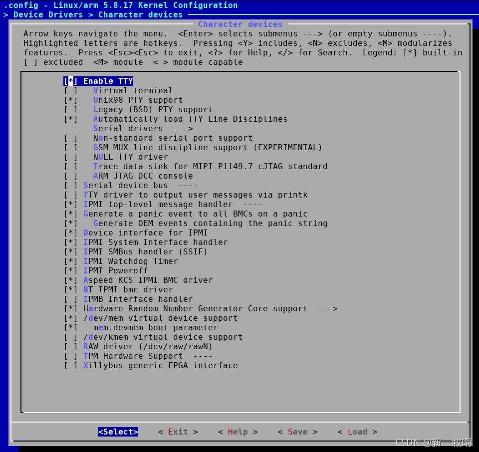 首层目录选中Device Drivers,找到character Device,回车选中,按照下图进行配置,配置完成后保存。