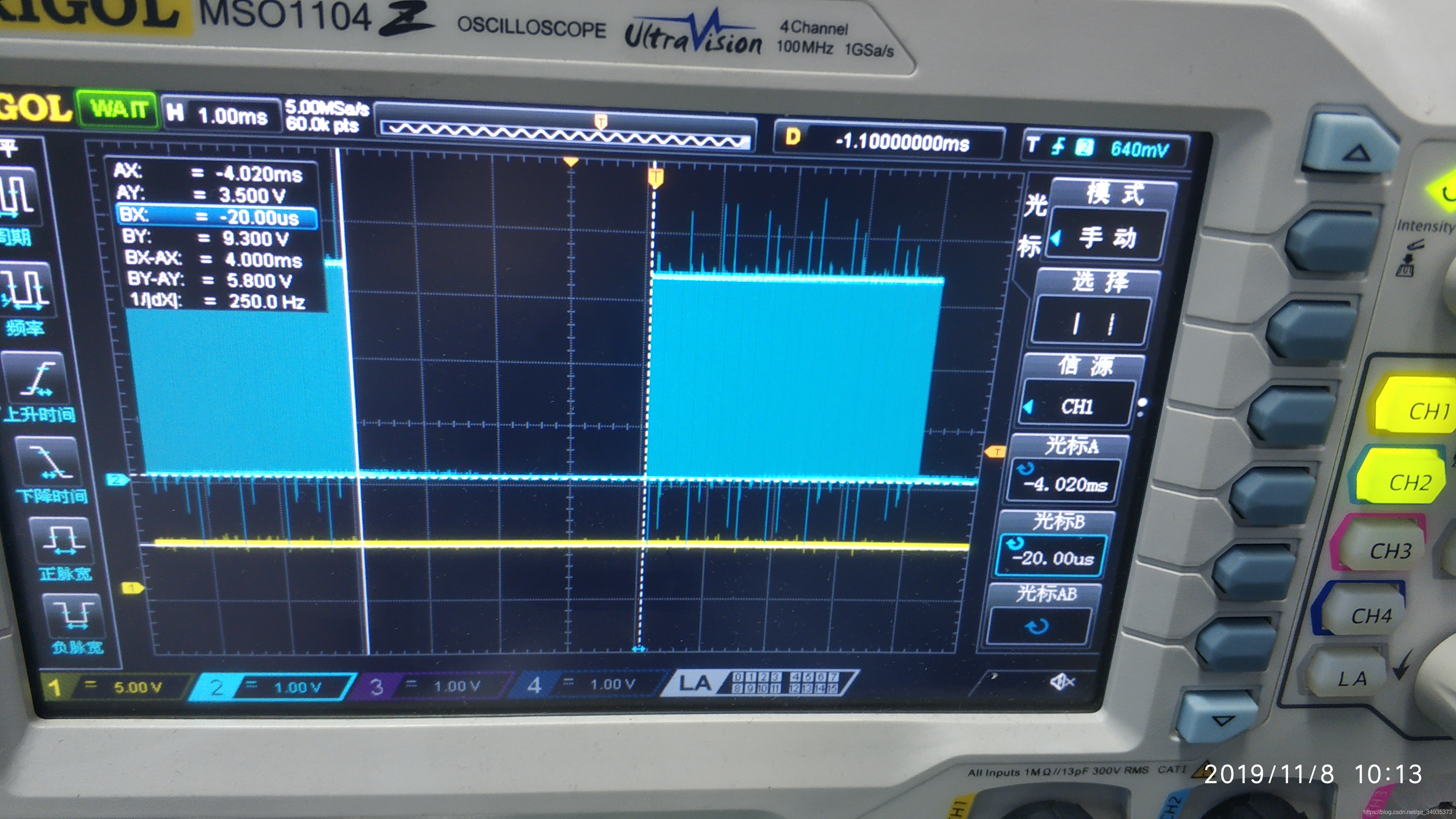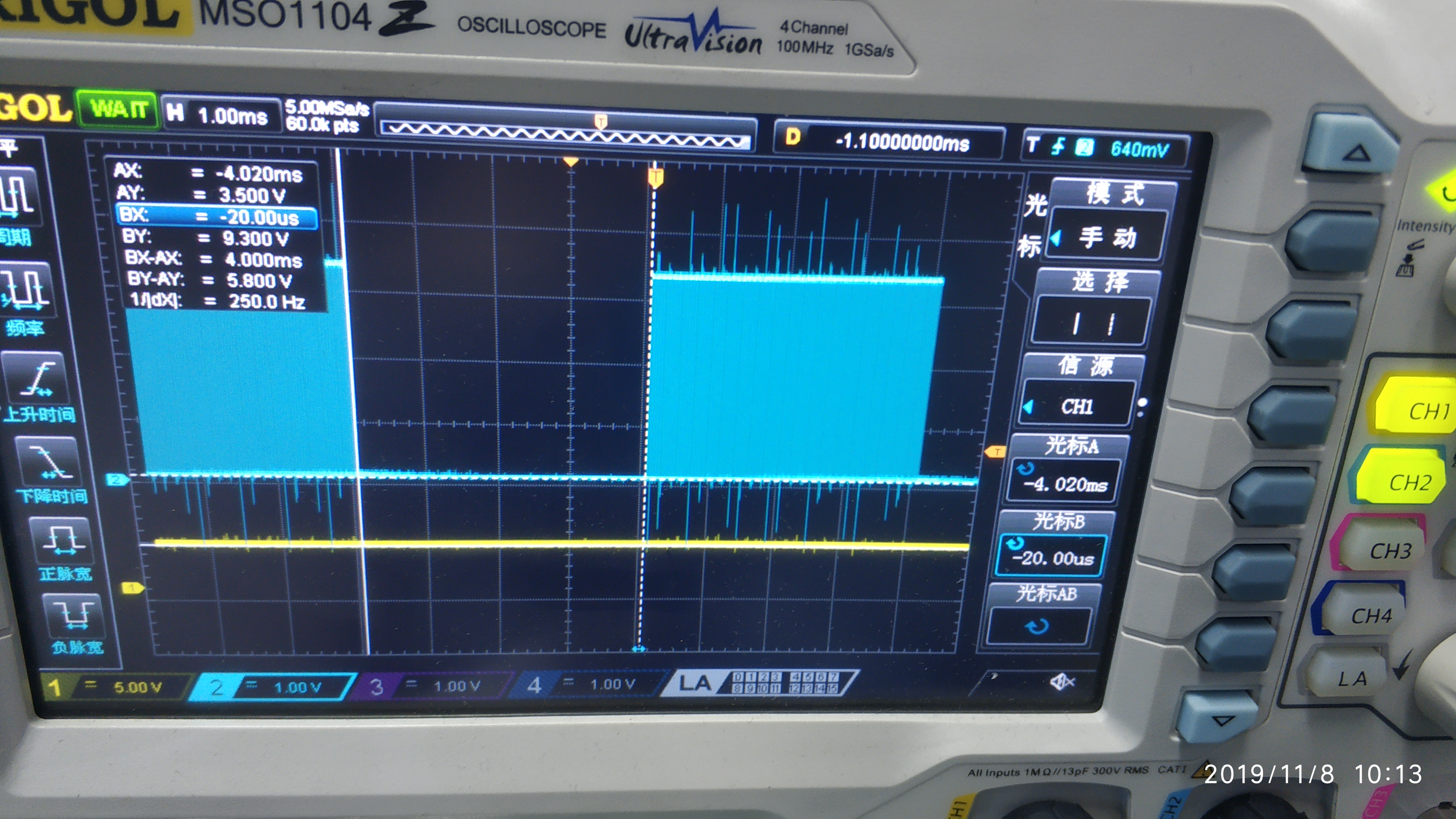 再次执行程序,这次观测到了目标的波形,这说明使用PRU访问gpio也需要先将gpio口写入export。