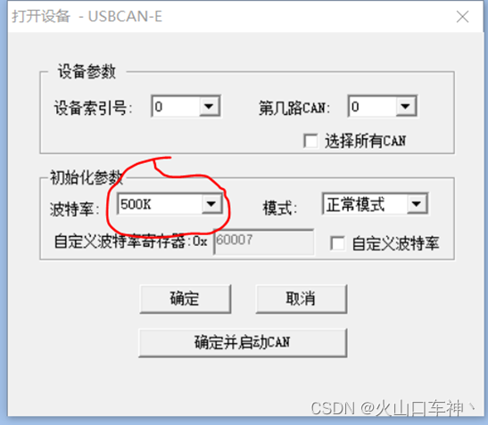 3、在“波特率”标签后选择CAN网络的实际波特率值,再点击“确定并启动CAN”,即可启动测试。(若有多个通道需要测试,比如2个,选择“选择所有CAN”,即可打开设备的2个通道,同时侦测。