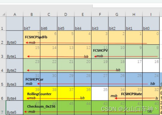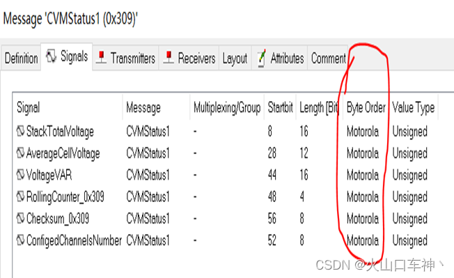 4、当一个信号的数据比较大时,超过8位,这就出现了跨字节的情况,这时就存在两种数据方向的类型。一种叫Intel格式,另一种叫做Motorola格式。