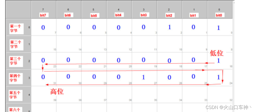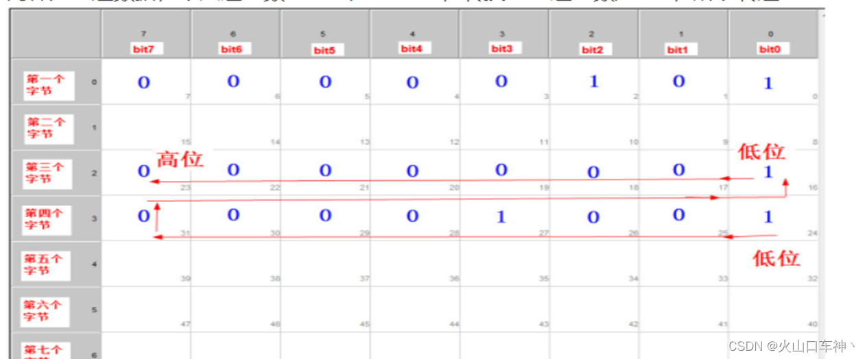 2、8个字节数据的布局图如下:每一行代表一个字节,每个单元格代表一个位。第一个字节包含bit0bit7,第二个字节包含bit8bit15,依此类推。