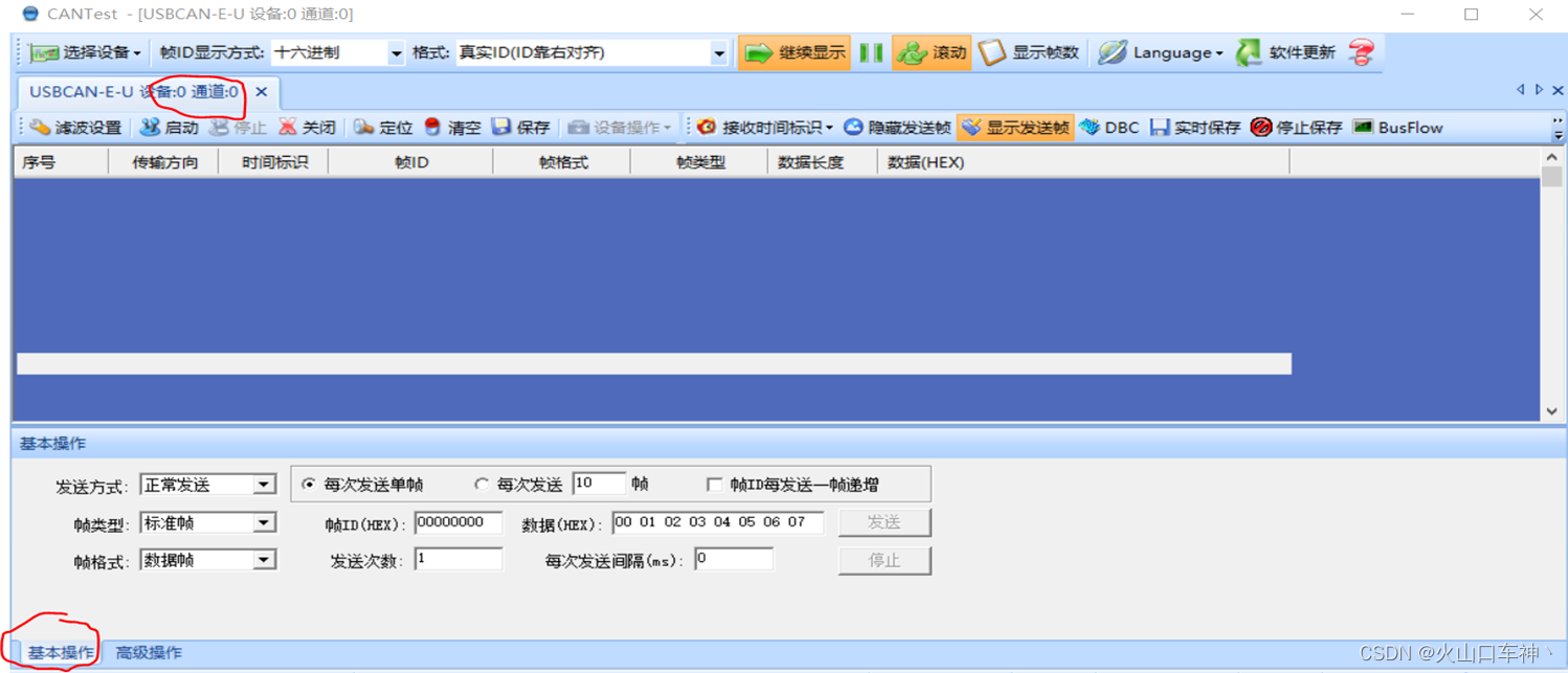 4、窗口左上部的通道0,主窗口显示接收和发送的报文信息,包括时间、ID、帧格式、类型、数据长度、实时数据等。下半部分的“基本操作”,用于向CAN网络发送一条报文。也可点击左下角的“高级操作”标签,切换到发送报文的高级模式。