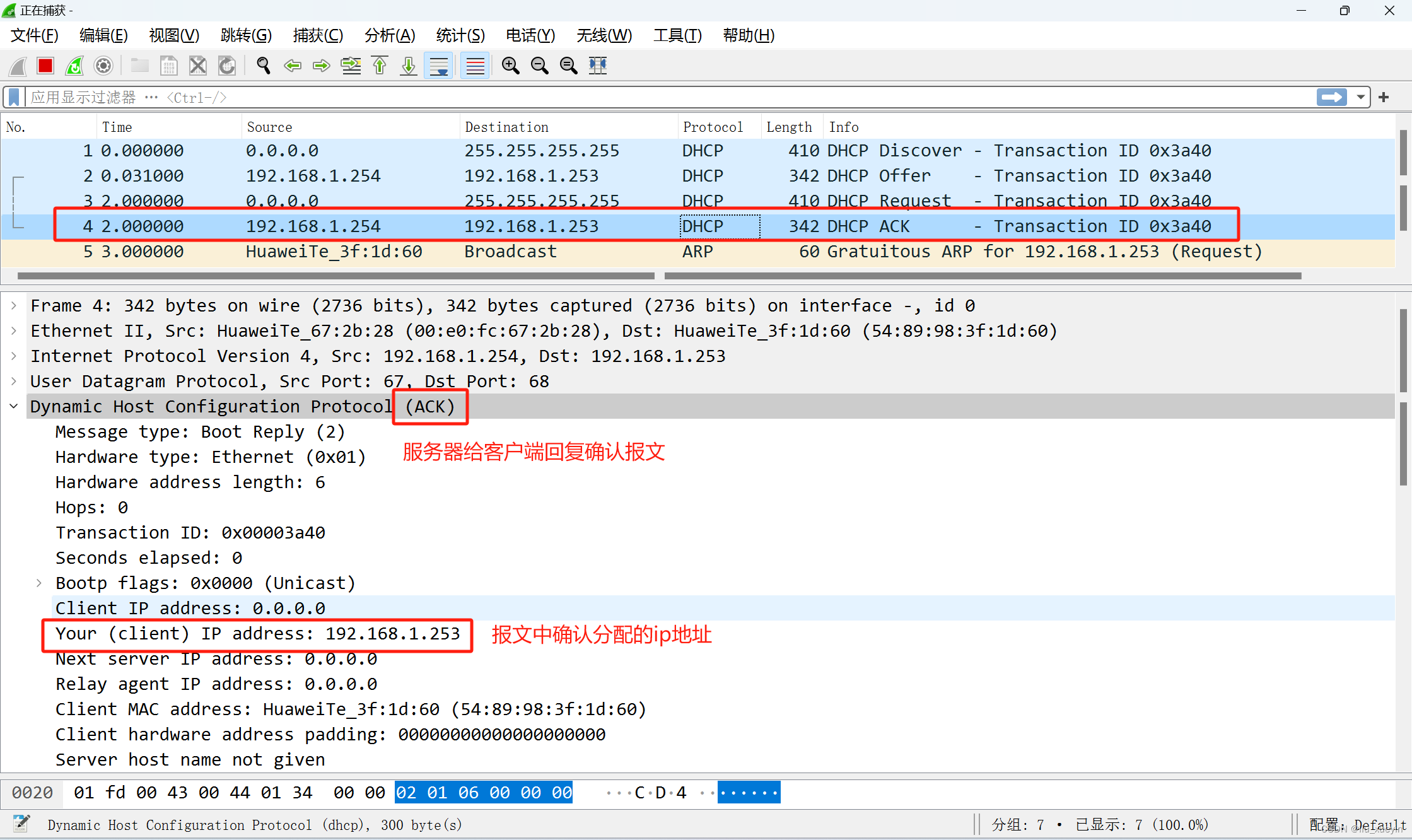 第四步、DHCP ACK报文(服务器确定租约),服务器发送确认报文,并从可分配ip池中删除该ip地址;此过程还是广播,目的是为了通知其他dhcp服务器也将该ip地址从地址池中删除!!