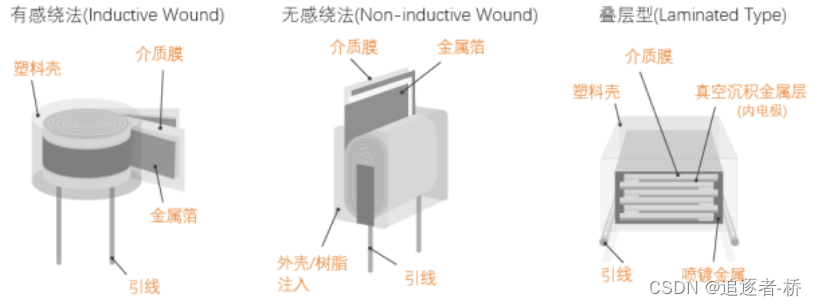 薄膜电容有两种卷绕方法:有感绕法在卷绕前,引线就已经和内部电极连在一起;无感绕法在绕制后,会采用镀金等工艺,将两个端面的内部电极连成一个面,这样可以获得较小的ESL,应该高频性能较高;此外,还有一种叠层型的无感电容,结构与MLCC类似,性能较好,便于做成SMD封装。