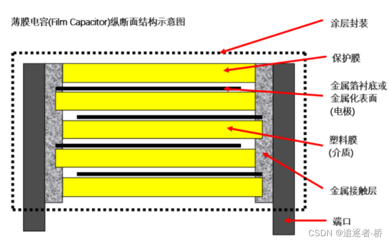 薄膜电容是通过将两片带有金属电极的塑料膜卷绕成一个圆柱形,最后封装成型;由于其介质通常是塑料材料,也称为塑料薄膜电容;其内部结构大致如下图所示: