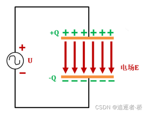 如上图所示,在两块距离较近、相互平行的金属平板上(平板之间为电介质)加载一个直流电压;稳定后,与电压正极相连的金属平板将呈现一定量的正电荷,而与电压负极相连的金属平板将呈现相等量的负电荷;这样,两个金属平板之间就会形成一个静电场,所以电容是以电场能的形式储存电能量,储存的电荷量为Q。
