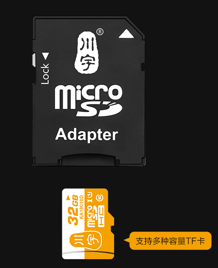 上图中黄色的是TF卡,黑色的是卡套,套上卡套之后就和下面的标准SD卡一样大小了。