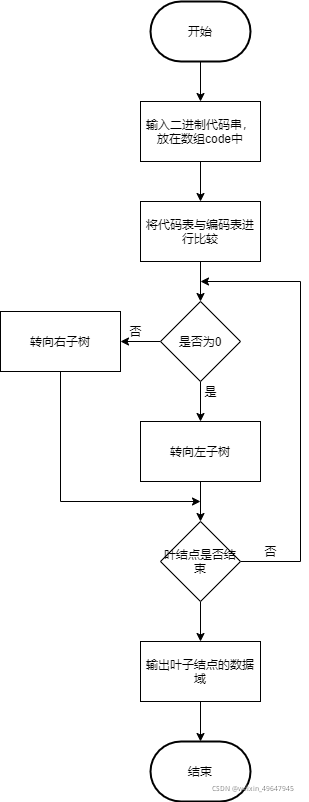 - 将代码与编码表进行比较,如果为0,则转向左子树;如果为1,则转向右子树,直到叶结点结束。输出叶子结点的数据域,即所对应的字符。