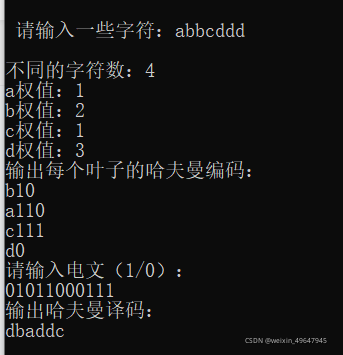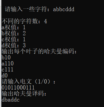 程序中主函数根据提示输入一些字符和字符的权值,则程序输出哈夫曼编码;若输入电文,则可以输出哈夫曼译码。