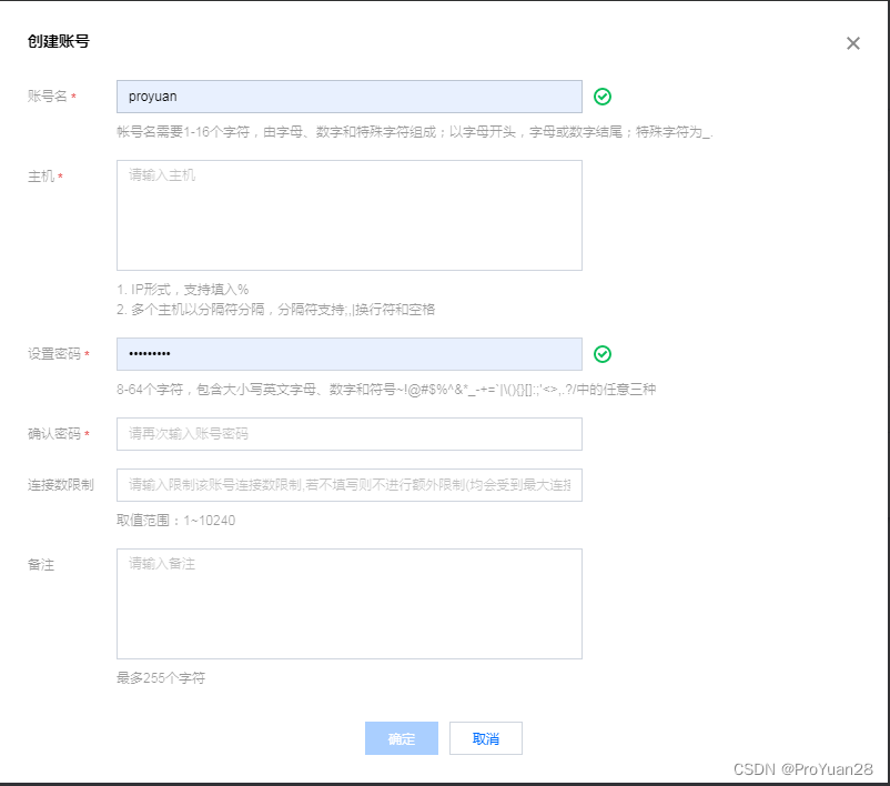 4. 在弹出的对话框,输入帐号名、密码、备注,确认无误后,单击确认。
