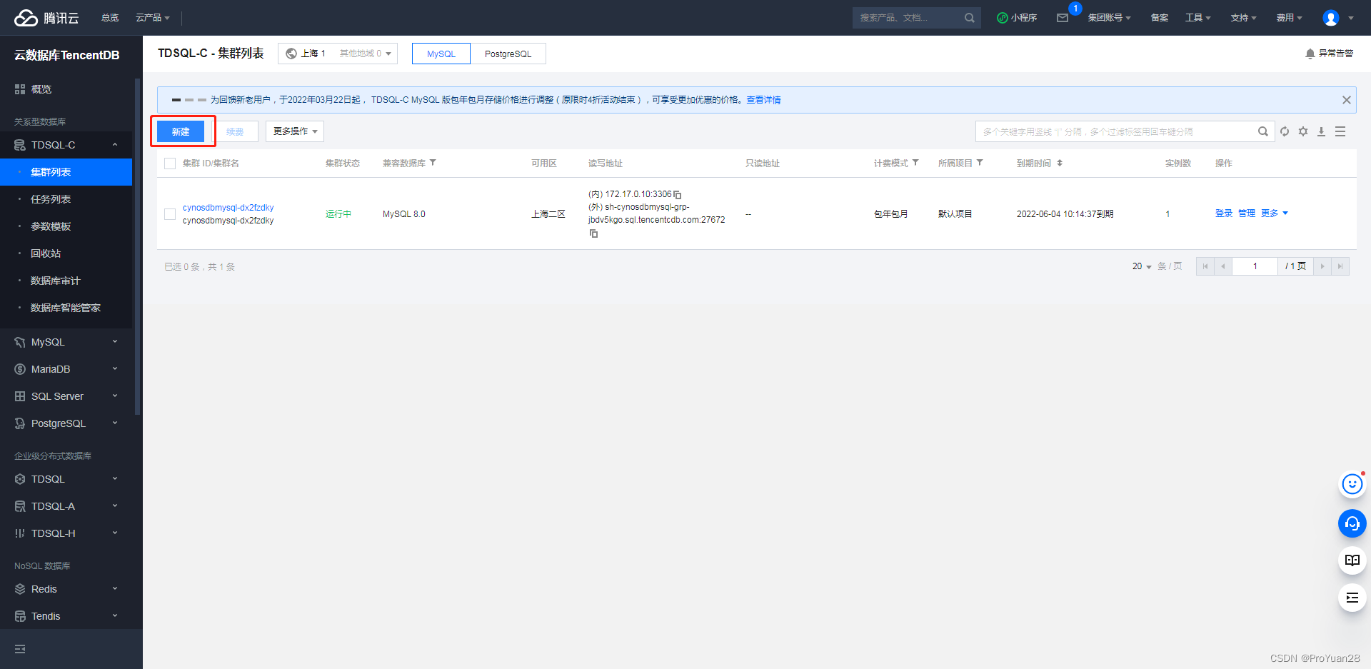 1、登录TDSQL控制台 ,在实例列表,单击新建,进入购买页。